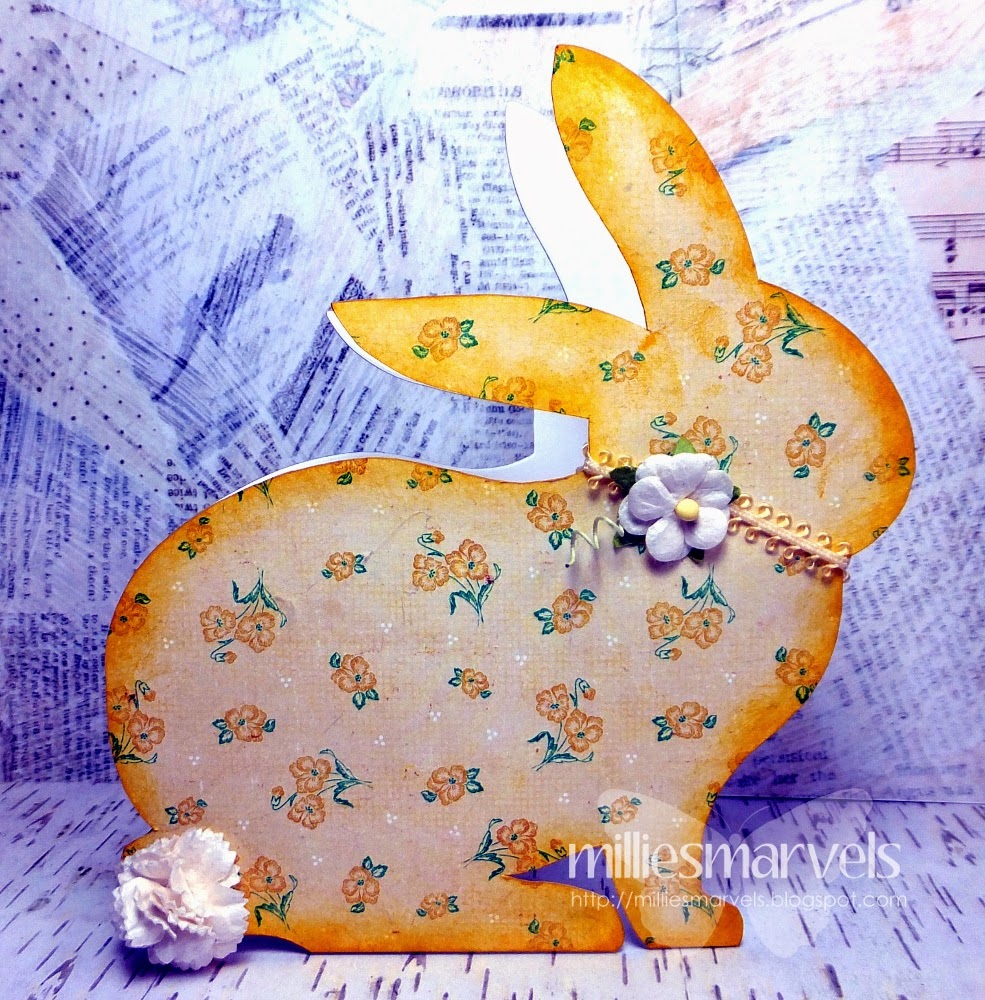 I simply used one card as a template to cut the patterned papers and inked around the edges with yellow distress inks. I added some loopy trim ribbon from The Ribbon Girl and some paper flowers. I used a paper carnation for the fluffy tail.